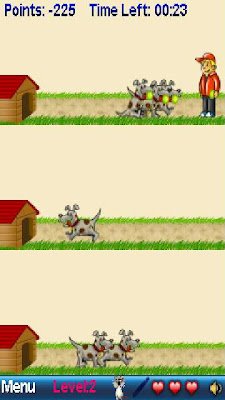 If you are on that lane to catch the ball back you score 5 points. If you are not on that lane you lose 10 points. If a dog has manage to reach the end of the lane without catching a ball he will get mad and jump and bite you are you will lose 1 life. If you throw a ball in a lane and no dog was there to take it and the ball reached the dog house you lose 10 points.